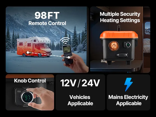 Breite Kompatibilität: Unsere Diesel-Standheizung ist kompatibel mit Wohnmobilen, LKWs, SUVs usw. Sie läuft mit 12 V/24 V Gleichstrom oder Wechselstrom und kann in Höhen unter 9842 Fuß (3000 m) betrieben werden. Ideal für Winterfahrten und den täglichen Gebrauch
