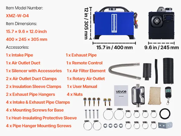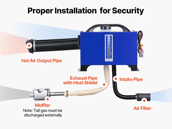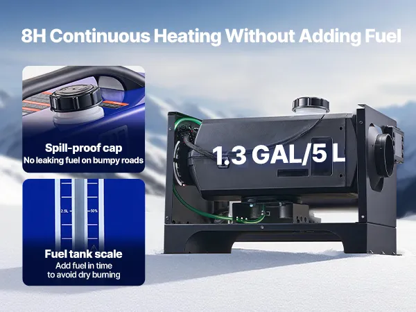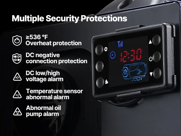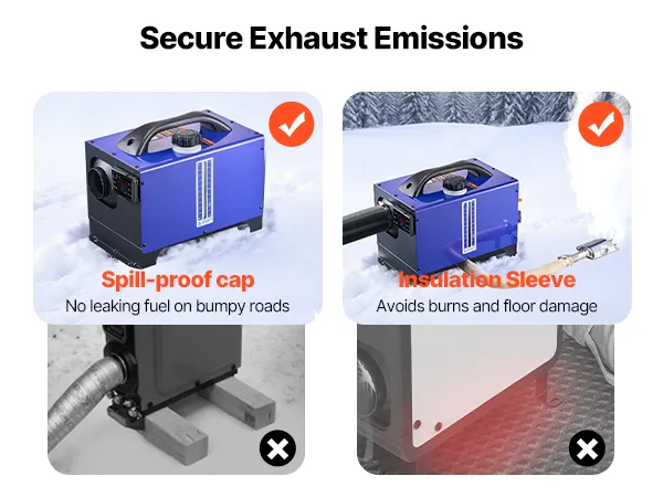 Sicherheitsfunktionen: Dieser Diesel-Lufterhitzer verfügt über eine Abgasrohr-Wärmemanschette, um das Risiko von Bodenschäden zu verringern. Der versiegelte Tankdeckel gewährleistet einen sicheren Langzeiteinsatz. Zu den integrierten Schutzfunktionen gehören Überhitzungsabschaltung (≥ 536 ℉ / 280 ℃), Verpolungsschutz und Überspannungsschutz