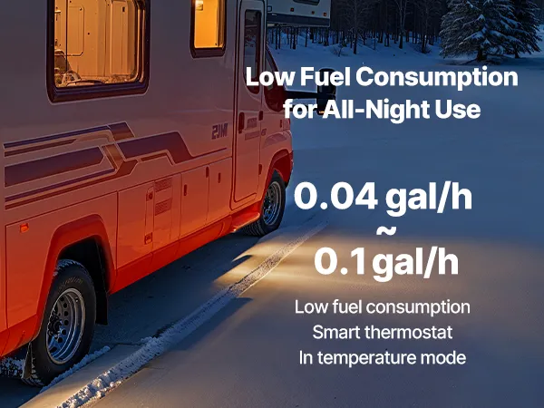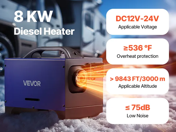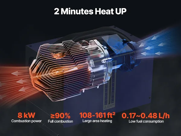 Schnelles Aufheizen: Unsere 8-kW-Dieselheizung heizt Räume von 108 bis 161 Fuß² auf bis zu 210 °F (ca. 99 °C) in 5 Minuten und schafft in 10 Minuten einen komfortablen Fahrzeuginnenraum. Sie arbeitet mit 12 V/24 V Nennspannung