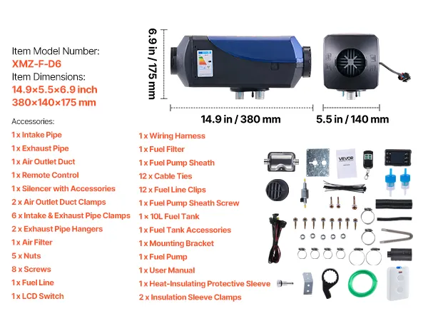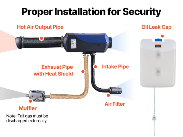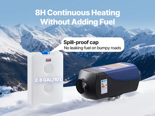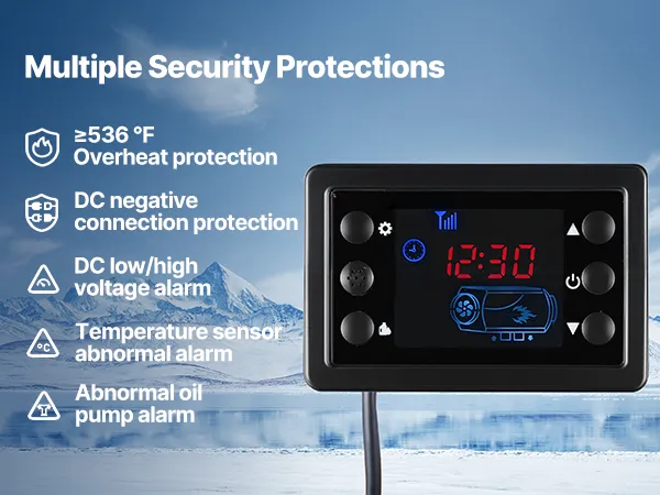 Sicherheitsfunktionen: Dieser Diesel-Lufterhitzer verfügt über eine Abgasrohr-Wärmemanschette, um das Risiko von Bodenschäden zu verringern. Der versiegelte Tankdeckel gewährleistet einen sicheren Langzeiteinsatz. Zu den integrierten Schutzfunktionen gehören Überhitzungsabschaltung (≥ 536 ℉ / 280 ℃), Verpolungsschutz und Überspannungsschutz