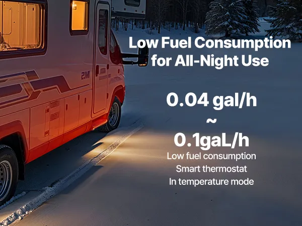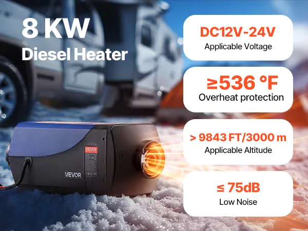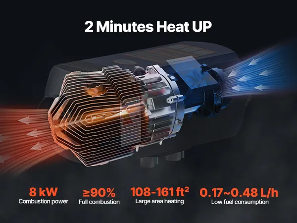 Schnelles Aufheizen: Unsere 8-kW-Dieselheizung heizt Räume von 108 bis 161 Fuß² auf bis zu 210 °F (ca. 99 °C) in 5 Minuten und schafft in 10 Minuten einen komfortablen Fahrzeuginnenraum. Sie arbeitet mit 12 V/24 V Nennspannung