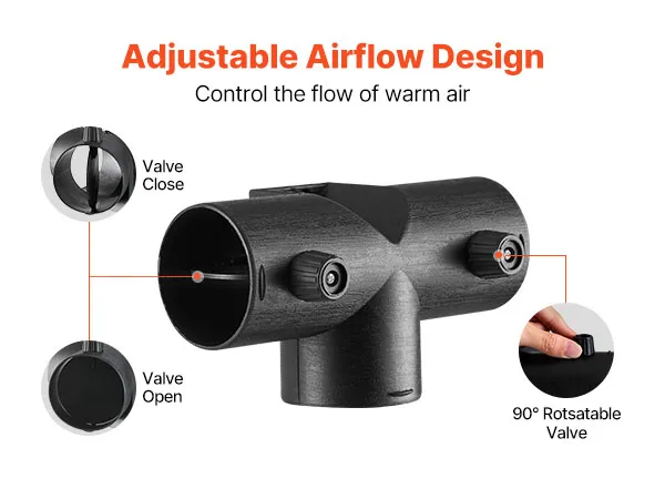Flexibler Luftstromregler: Das Zubehör für den Dieselheizungskanalanschluss verfügt über einen T-förmigen Auslass mit um 90° verstellbaren Ventilen. Dieses Design leitet den Luftstrom effizient und ermöglicht die einfache Auswahl der Auslassposition für eine bessere Heizungssteuerung in verschiedenen Einstellungen