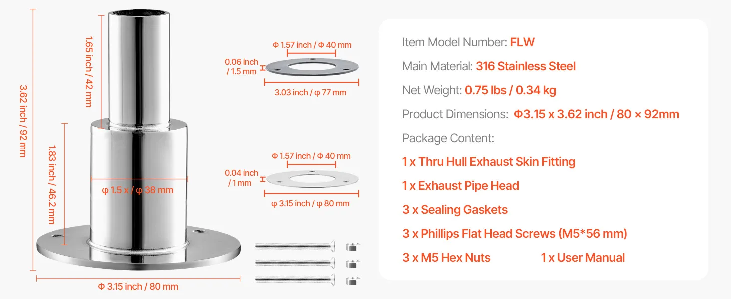Der Durch-Rumpf-Auspuff ist für den Anschluss von Dieselheizungen oder Auspuffrohren konzipiert und eignet sich daher ideal für eine Vielzahl von Anwendungen. Das Produkt ist für den Einsatz in verschiedenen Umgebungen konzipiert und eignet sich für Boote, Schiffe, PKW und Lkw. Es unterstützt ein effizientes Abgasmanagement.