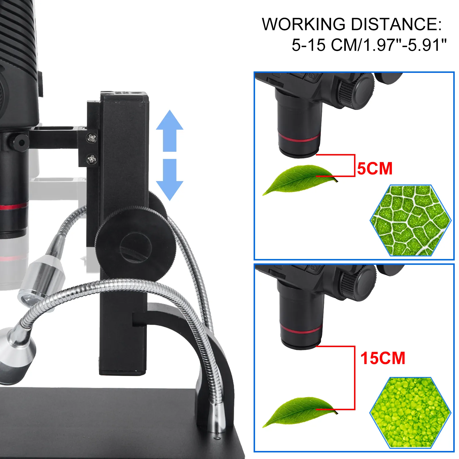 Dieses digitale Mikroskopstativ ist höhenverstellbar mit einem Arbeitsabstand von 5-15 cm/1,97"-5,91" und bietet Ihnen eine variable Vergrößerung für unterschiedliche Bedürfnisse.
