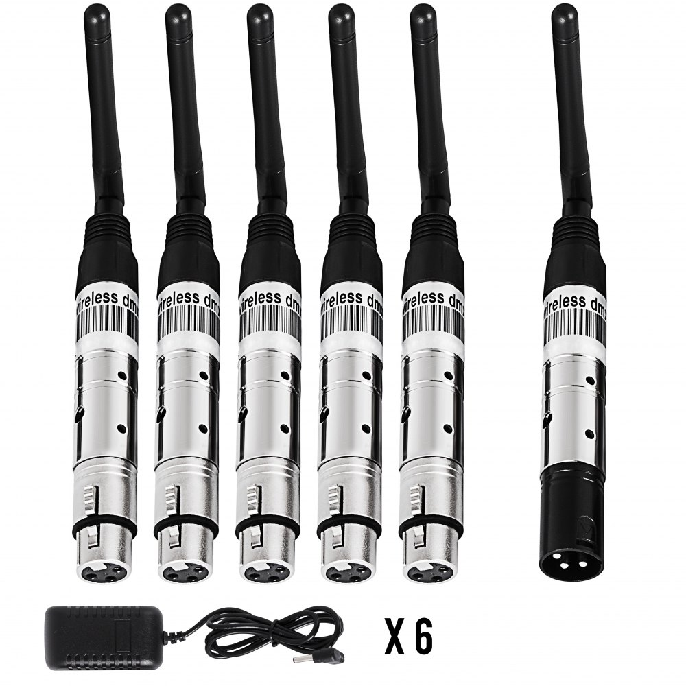 The listing is about DMX512 wireless system: 1 transmitter, 5 receiver, with 6 power adapter, for stage lighting control. Just plug the transmitter into stage lamp console, plug the receivers into stage lamp and you will be free to control stage lamp without wire. It's the perfect way to get rid of the trouble of winding wire.