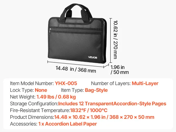 VEVOR feuerfeste Dokumententasche Aktentasche, 1000 °C wärmeisolierte, wasserfeste Dokumentenaufbewahrungstasche mit einem 12-seitigen Akkordeonordner für Reisepässe wichtige Dokumente Schwarz