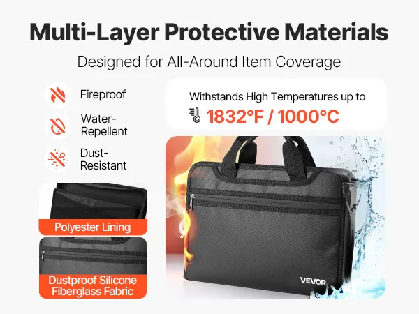 Diese feuerfeste Dokumententasche hält Temperaturen von 1000 °C stand und ist wasser- und staubdicht. Mit einem 12-seitigen Akkordeonordner im Inneren und einem Gewicht von nur 0,68 kg bietet sie Platz für Akten und Elektronik. Ein wasserfester Reißverschluss sorgt für mehr Sicherheit zu Hause, im Büro oder auf Reisen.