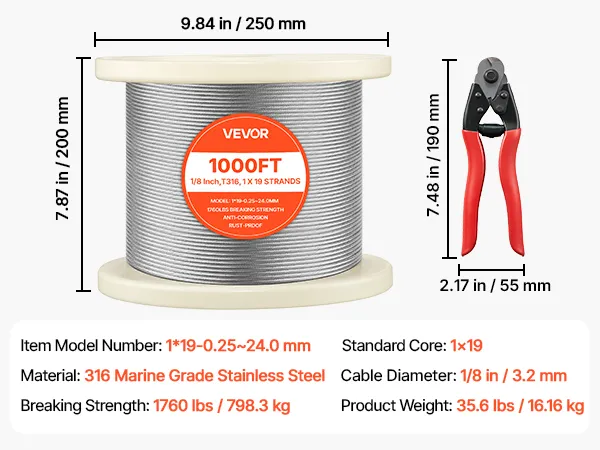 VEVOR Edelstahldrahtseil φ3,2 mm 304,8 m Länge, Drahtseil aus Edelstahl 316 mit einer Bruchlast von 798,3 kg, 1x19 Litzen, Stahlseil für Terrassengeländer, Gartenspaliere, inkl. Drahtschneider