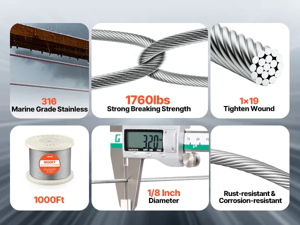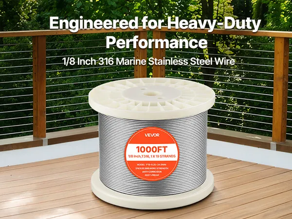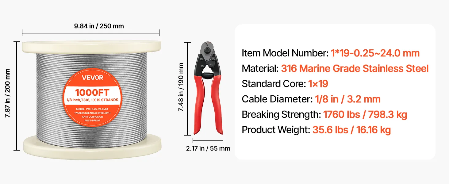 Dieses 1x19-Drahtseil aus seewasserbeständigem Edelstahl 316 vereint hohe Festigkeit mit Korrosionsbeständigkeit. Das 3,2 mm (1/8 Zoll) dicke Seil bietet eine Bruchlast von bis zu 798,3 kg (1760 lbs) auf einer 304,8 m (1000 Fuß) langen Spule – ideal für Geländer, Zäune, Rankgitter und Beleuchtung. Ein ergonomischer Schneidkopf ermöglicht saubere und präzise Schnitte.