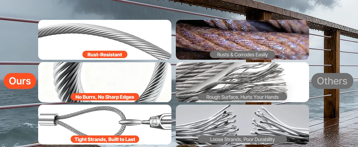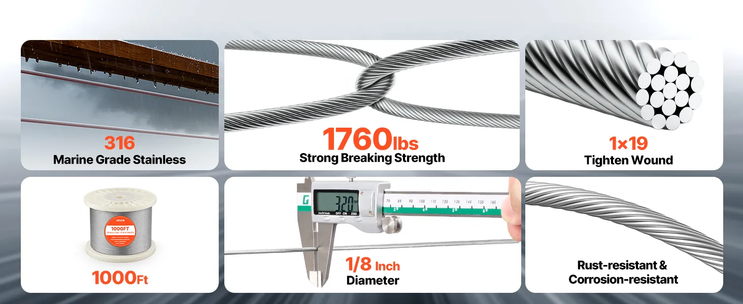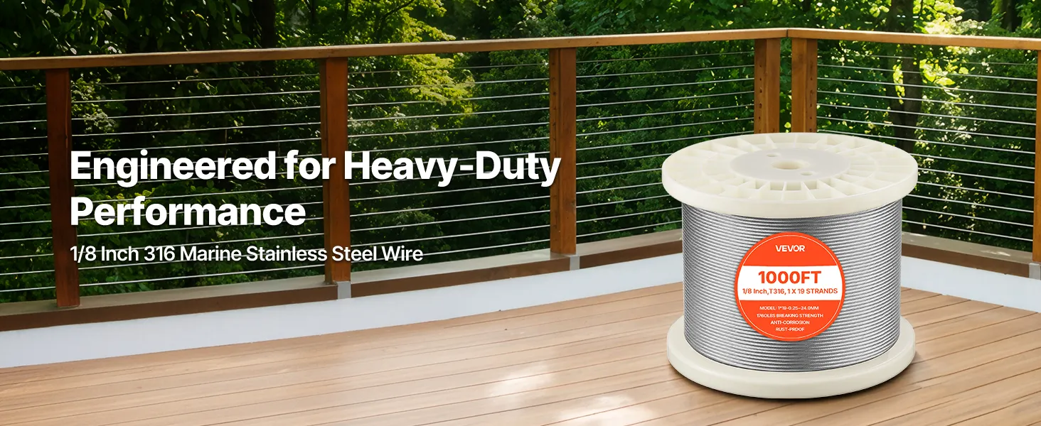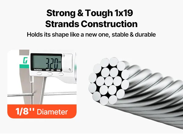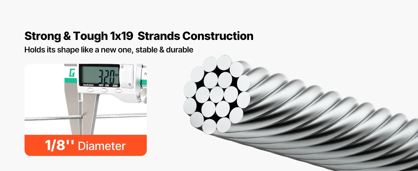 3,2 mm (1/8 Zoll) Durchmesser & 798,3 kg (1760 lbs) Bruchlast: Dieses Stahlseil bietet hohe Belastbarkeit für Geländer, Zäune und Hängekonstruktionen. Es sorgt für Stabilität bei der dauerhaften Nutzung im Innen- und Außenbereich unter alltäglichen Belastungen
