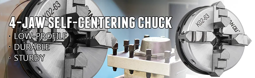 Als Teil einer Drehmaschine ist das selbst zentrierende Spannfutter mit 4 Backen, die stark, langlebig und verschleißfest sind. Es klemmt die Gegenstände fest und sorgt für hohe Präzision. Die nach innen abgestuften Backen können mit jedem schlanken Material umgehen.