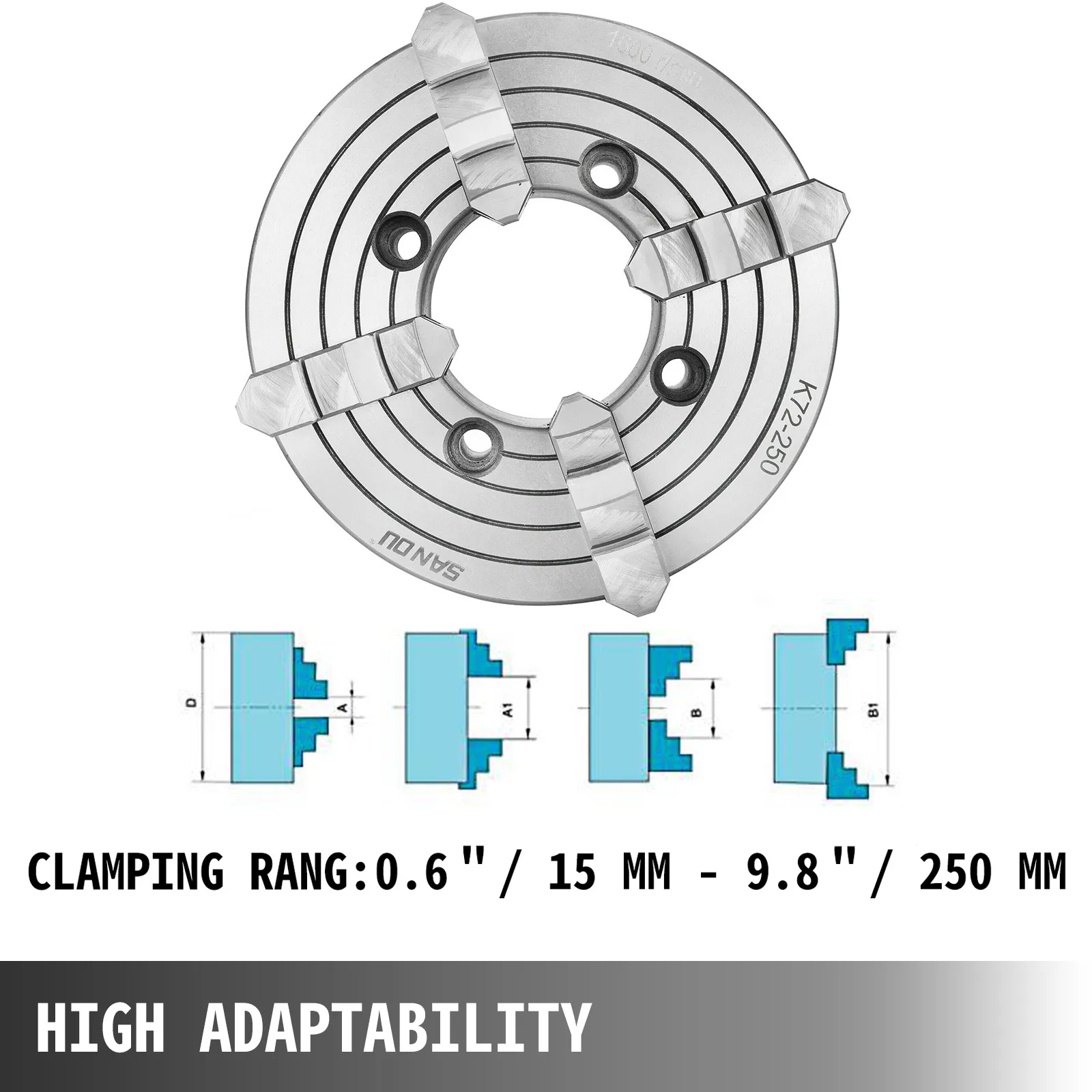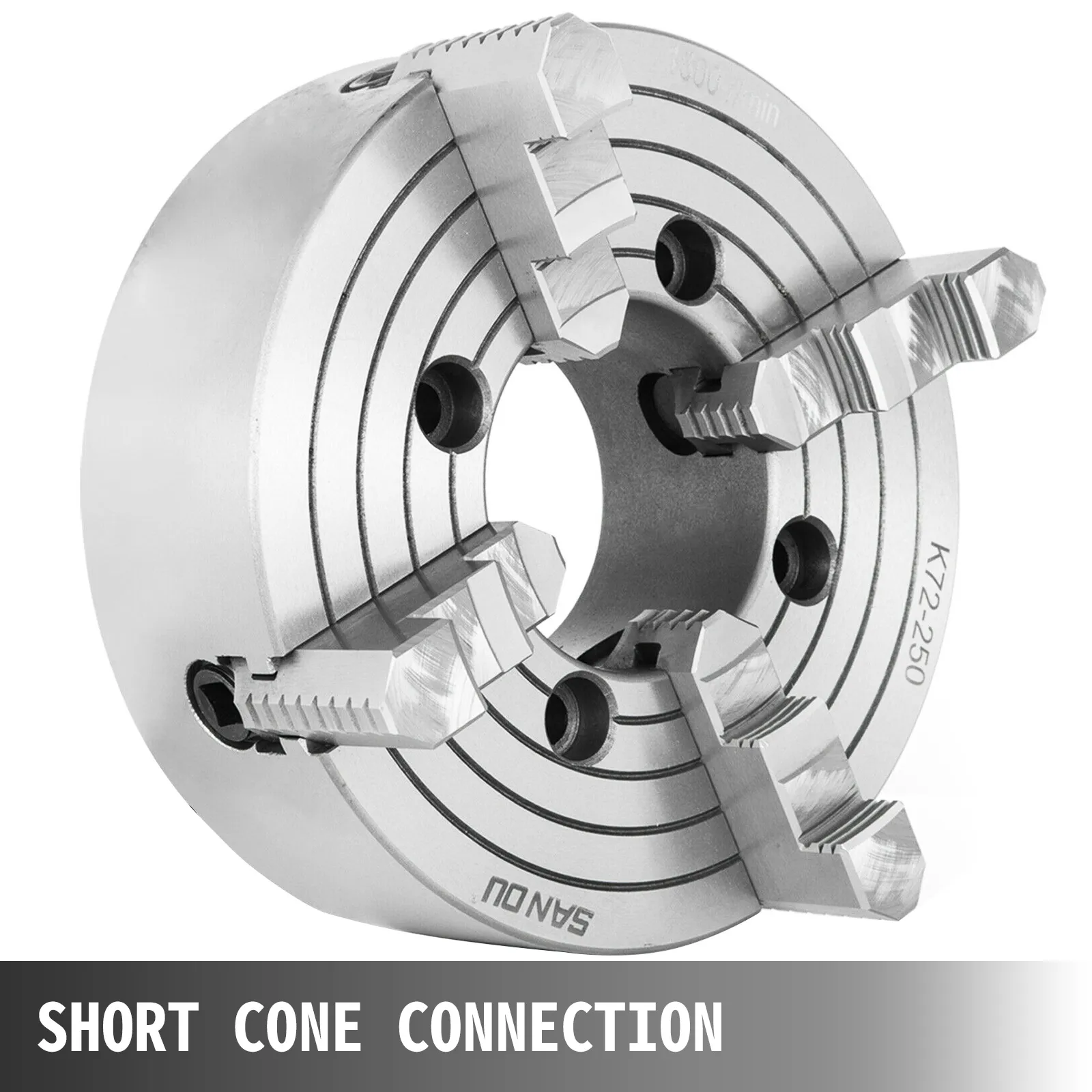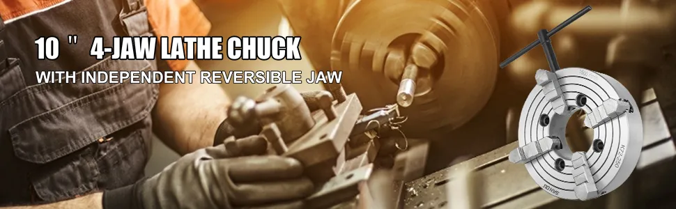 Dieses vielseitige Drehfutter ist aus hochwertigem, gehärtetem Stahl gefertigt, druckfest und hat eine lange Lebensdauer. Dieses Futter ist eine kurze konische Verbindung mit hoher Zentriergenauigkeit, guter Steifigkeit und kurzer Ausladung. Die vier Backen dieses Futters sind unabhängig und umkehrbar und können Industrieteile mit Abmessungen von 15 mm - 250 mm aufnehmen. Das 4-Backen-Futter hat einen großen Spannbereich und eine große Spannkraft und eignet sich für Industrieteile mit komplexen Formen, die nicht von einem selbstzentrierenden 3-Backen-Futter gehalten werden können.