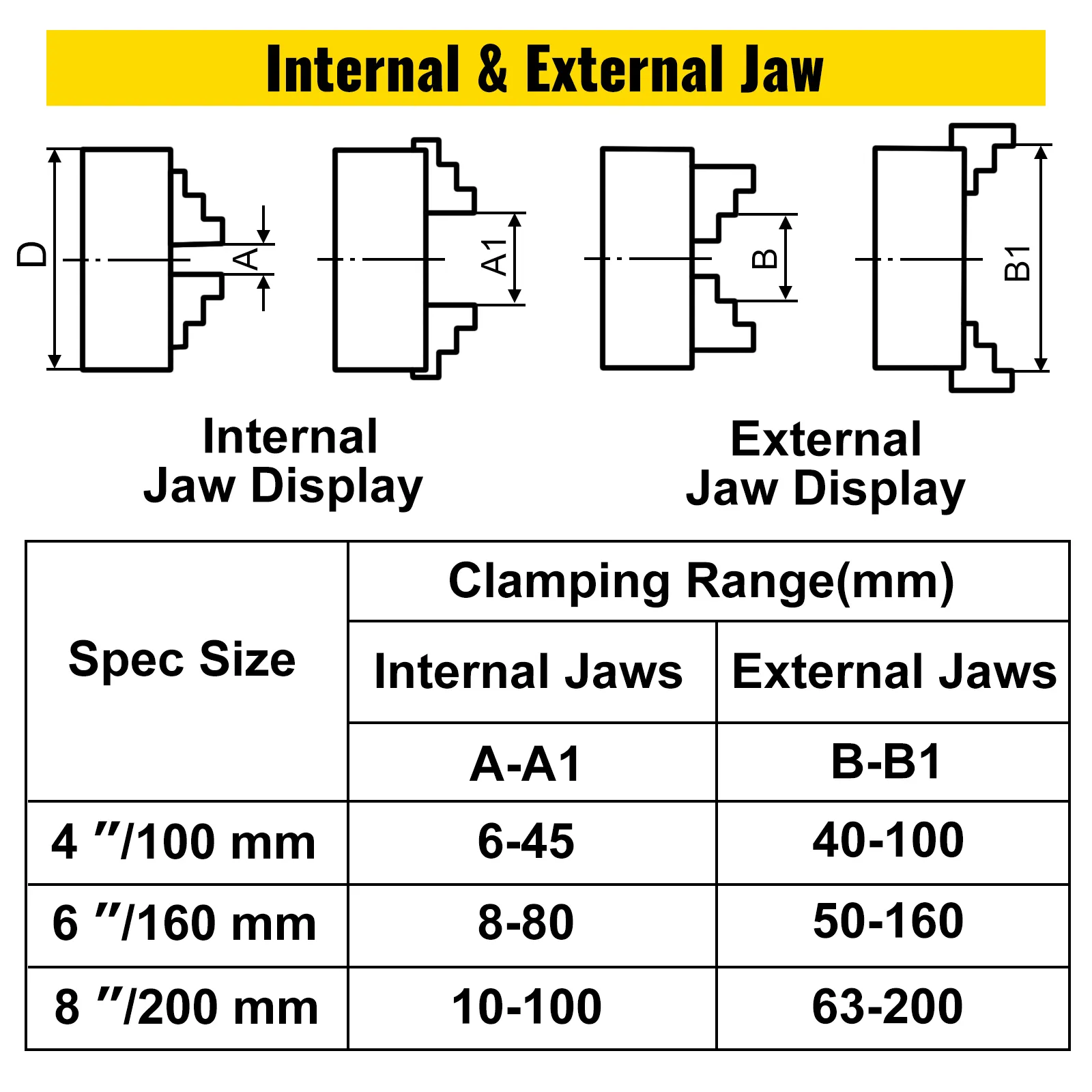 • 【BREITER SPANNBEREICH】 - Das Spannfutter verfügt über einen Innenspannbereich von 8 mm bis 80 mm. Der Außenspannbereich ist von 50 mm bis 160 mm. So kann es verwendet werden, um verschiedene industrielle Teile zu klemmen.