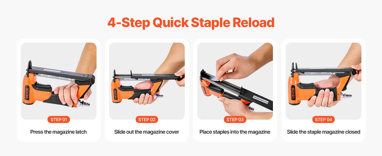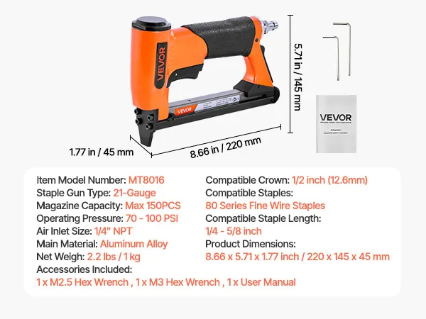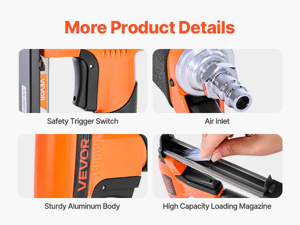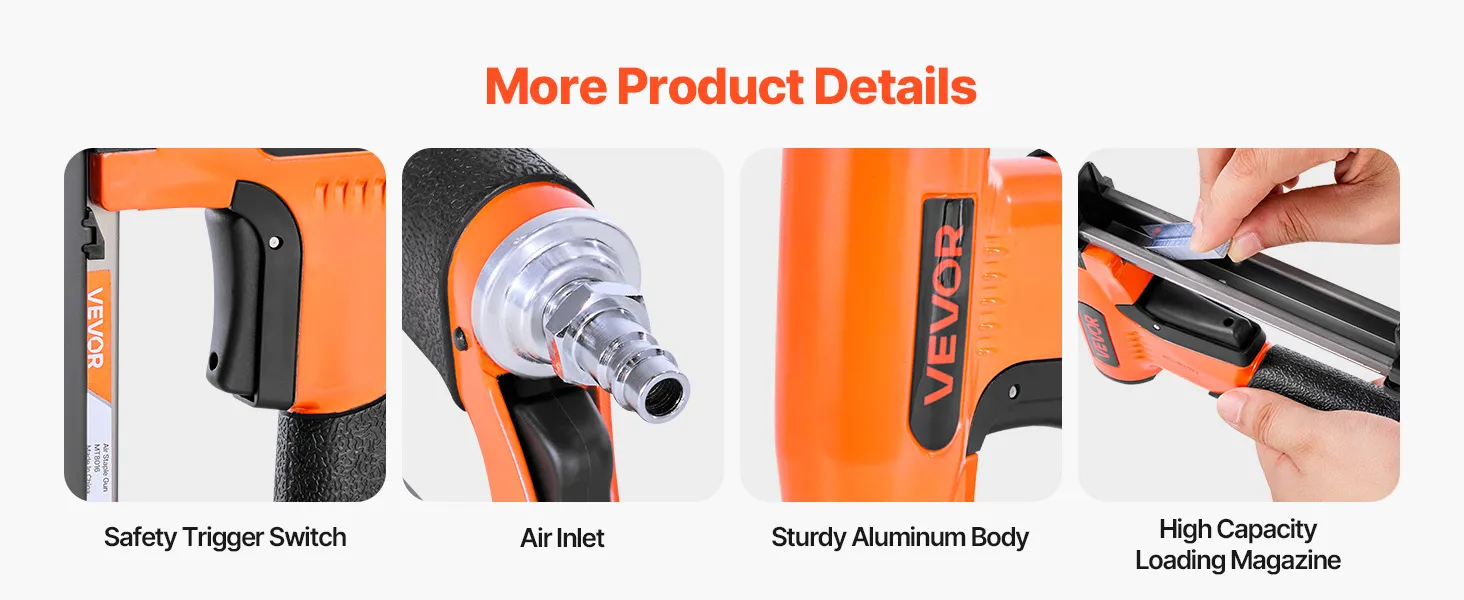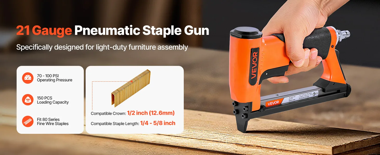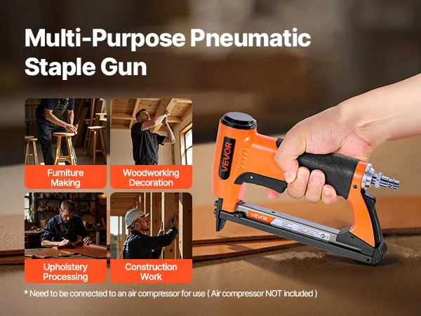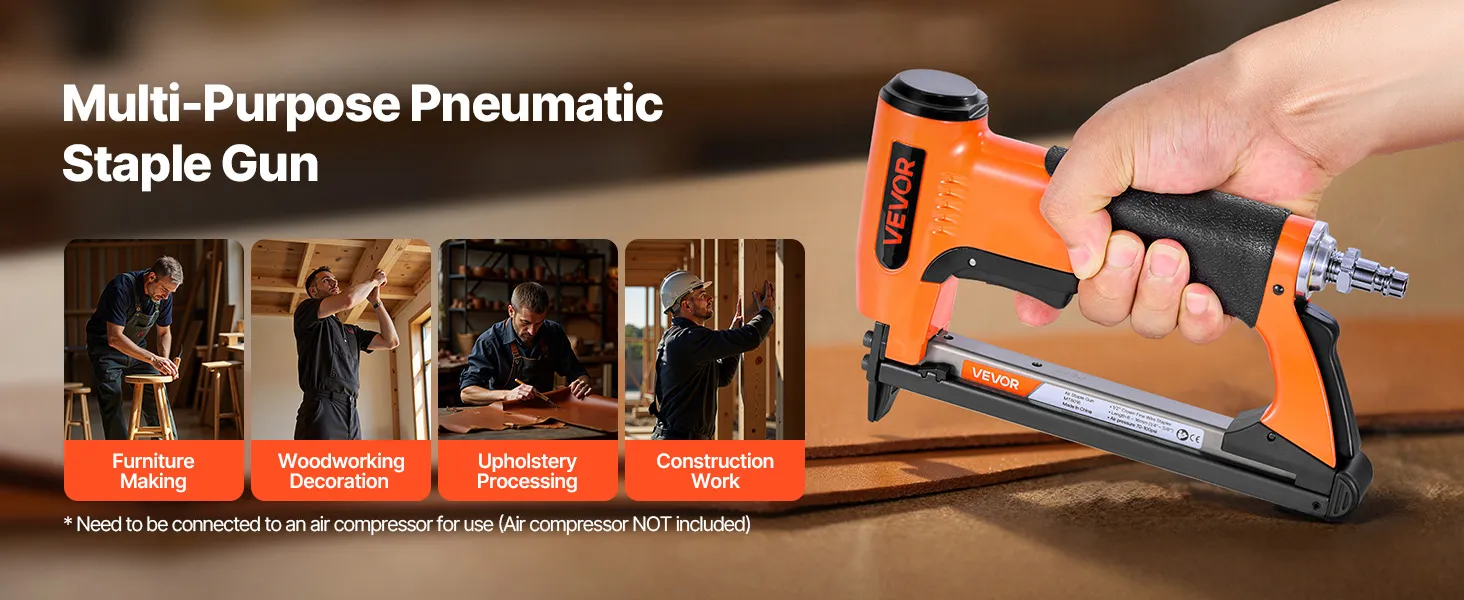 Geeignet für Polsterarbeiten, leichte Möbelmontage, Holzbearbeitung, Schrankmontage, Bilderrahmen, Anbringen von Zierleisten, Herstellung von Sofas, Stühlen und weitere Heimwerkerprojekte. Zur Verwendung muss es an einen Luftkompressor angeschlossen werden (Luftkompressor nicht im Lieferumfang enthalten).