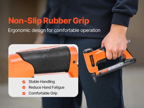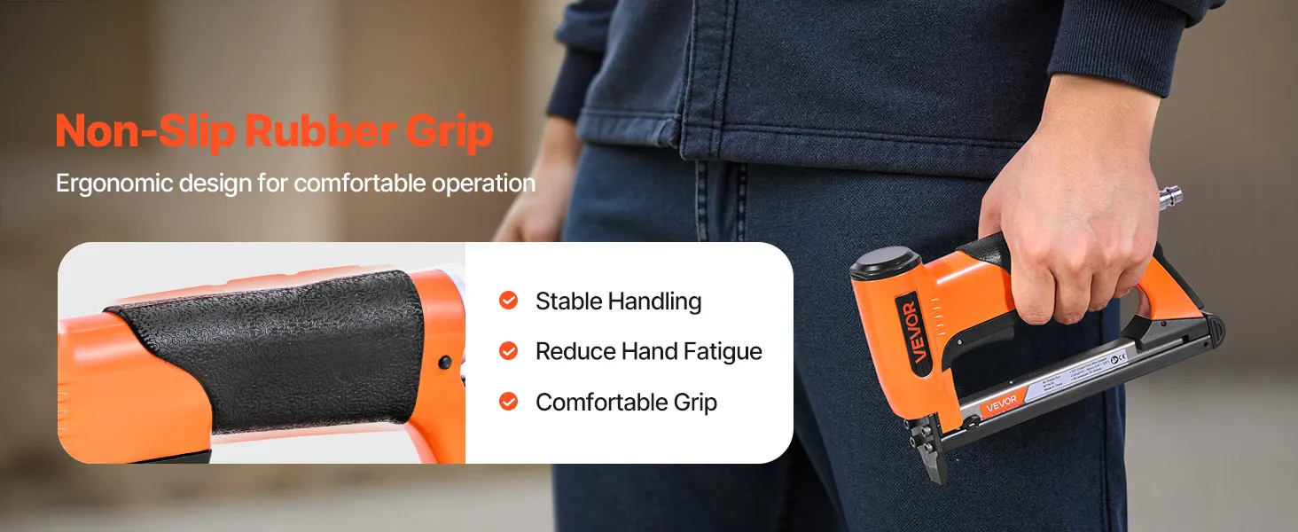 Komfortabler Griff: Ausgestattet mit einem ergonomischen, rutschfesten Gummigriff und einer leichten Bauweise bietet dieser leichte Drucklufttacker eine bessere Kontrolle sowie einen weichen und sicheren Halt, der die Ermüdung der Hand bei längerem Gebrauch reduziert.