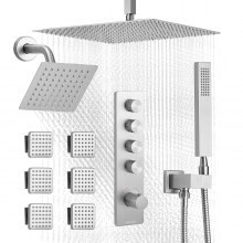 VEVOR Shower Faucet Set, 406 mm Thermostatic Ceiling Mount Rainfall Shower System with 152 mm Wall Mount Head, 6 Body Jets and Handheld Spray, Dual Rain Head Brass Valve and Trim Kit, Brushed Nickel
