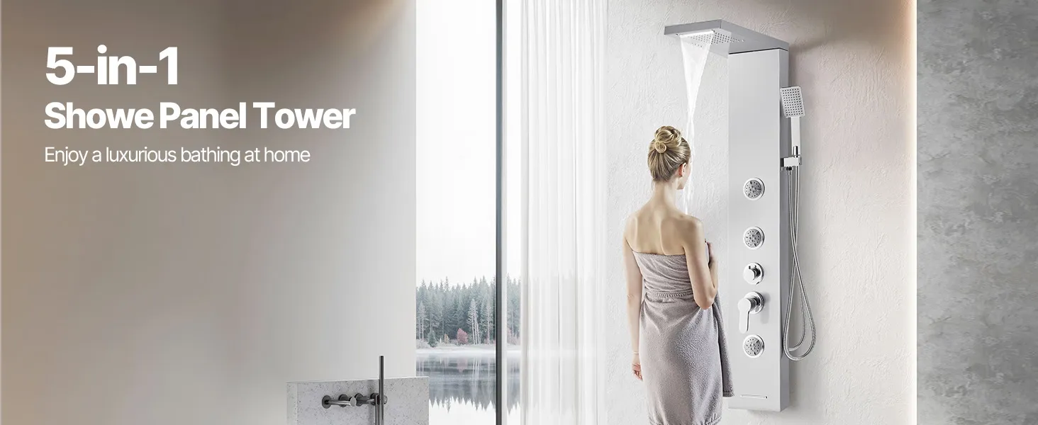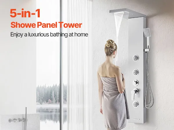 5 in 1 Duschsystem: Dieses Duschpaneel-Turmsystem bietet Regen, Wasserfall, 3 große Massagedüsen für den gesamten Körper, Badewannenauslauf und Handbrause. Es erfüllt vielfältige Bedürfnisse – vom schnellen Abspülen bis zur tiefen Entspannung