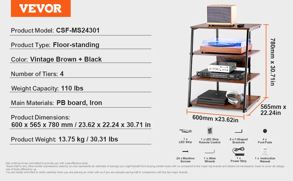 Dieser Medienständer trägt bis zu 50 kg pro Regal. Die Regale sind aus hochwertiger PB-Platte gefertigt, was Langlebigkeit bietet, während der Rahmen aus hochwertigem pulverbeschichtetem Eisen gefertigt ist und so eine stabile, wackelfreie Struktur gewährleistet.