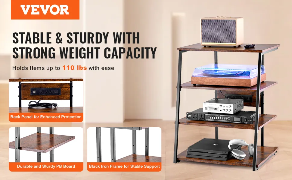 Stabiles Bodenregal: Dieses Audio-Video-Medienregal trägt bis zu 110 lbs (50 kg) pro Regalboden und besteht aus hochwertiger PB-Platte und einem robusten pulverbeschichteten Eisenrahmen, der für Stabilität ohne Wackeln sorgt.