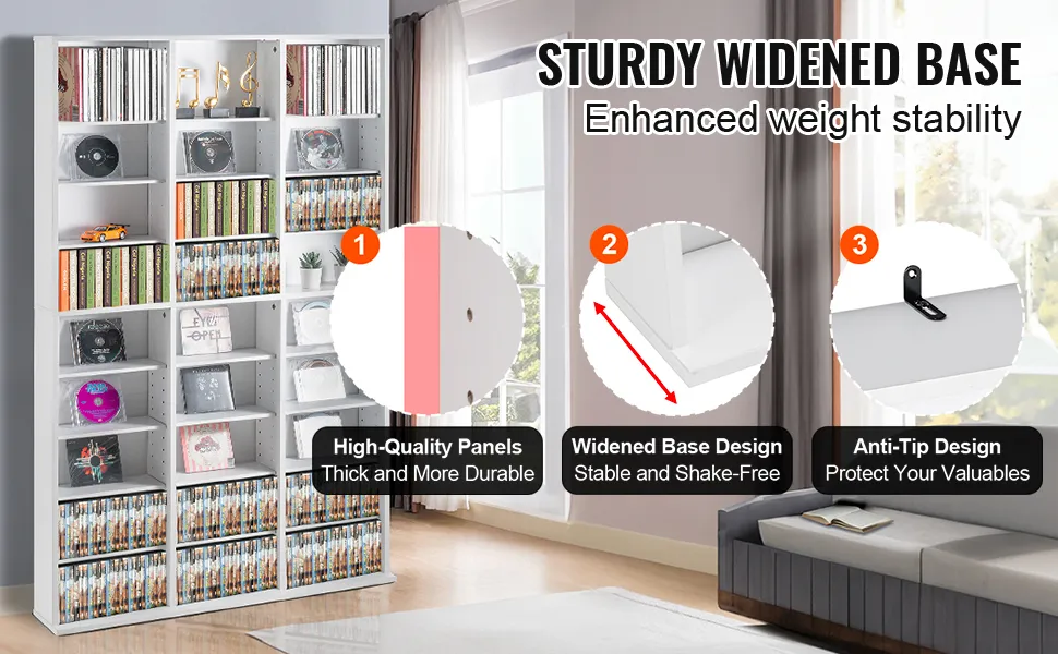 Dieses DVD-Regal ist solide gebaut. Es verfügt über eine verbreiterte Basis, die Stabilität gewährleistet. Sie müssen sich keine Sorgen machen, dass es wackelt. Das Kippschutzdesign schützt das Regal vor versehentlichen Stößen. Dadurch kann es sicher in belebten Räumen verwendet werden. Die robuste Konstruktion trägt schwere Lasten, ohne Kompromisse bei der Sicherheit einzugehen. Jedes Fach kann bis zu 2,5 kg tragen. Das bedeutet, dass es ideal für die Aufbewahrung verschiedener Gegenstände ist. Das langlebige Design sorgt für Ordnung in Ihrer Sammlung. Sie können beruhigt sein, da Sie wissen, dass Ihre Gegenstände sicher sind. Diese Stabilitätsfunktion ist wichtig für Familien mit Kindern oder Haustieren. Das Kippschutzdesign hilft, Unfälle zu vermeiden.