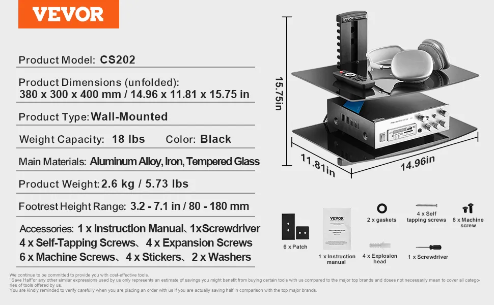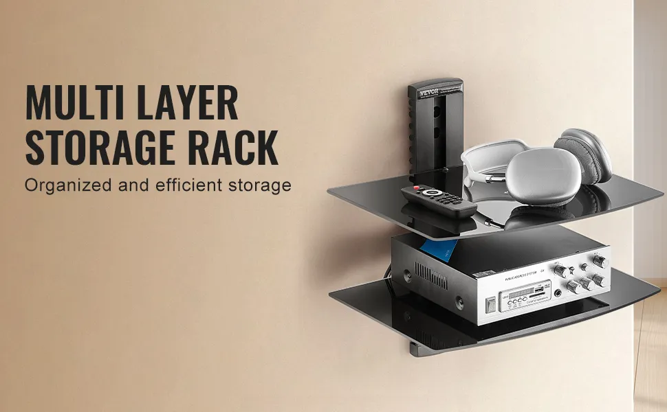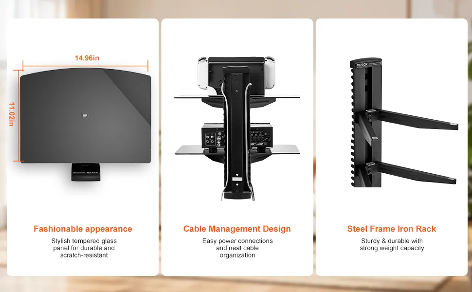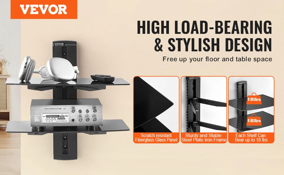 Stabiles Wandregal: Dieses wandmontierte Audio-/Videomedienregal bietet sicheren Halt mit einer Tragfähigkeit von bis zu 18 lbs (8 kg) pro Regalboden. Er verfügt über langlebiges, kratzfestes Hartglas und einen stabilen Rahmen aus Stahlplatten.