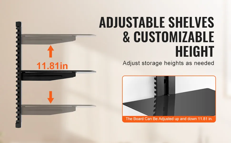 Verstellbare Ablageböden: Die schwebende Ablage für die Projektor-Wandmontage ist in der Höhe um 11,81 Zoll (30 cm) verstellbar, sodass individuelle Ablagehöhen für verschiedene Geräte möglich sind.