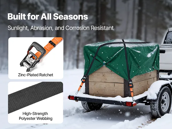 Rust-Resistant Durability: The zinc-plated ratchet and hardware pair with abrasion-resistant polyester webbing. The set of cargo tie-down strap stands up to sun, rain, and road grime for reliable, long-lasting tie-downs