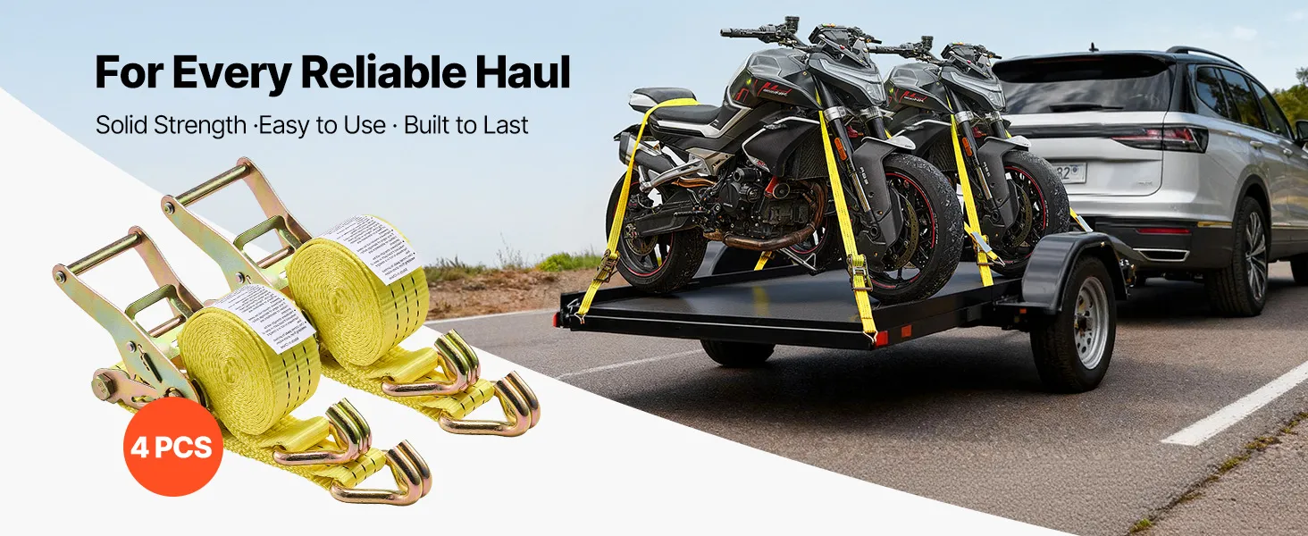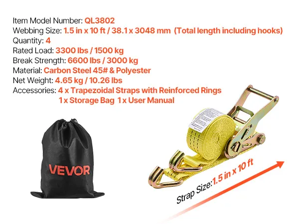 VEVOR Spanngurte, 38,1x3048 mm, Hochleistungs-Zurrgurte mit Doppel-J-Haken, 3000 kg Bruchlast, Tragetasche, Ratschenmechanismus für Umzüge, Anhänger, Motorräder, Kajaks, Autodächer, 4er-Pack
