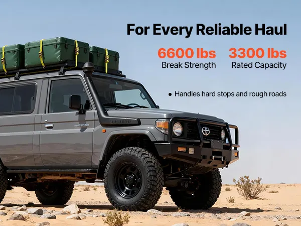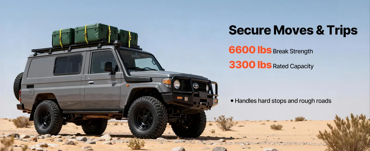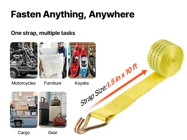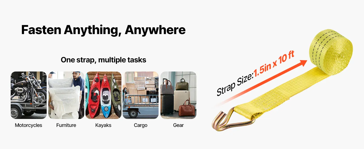 Ein Gurt, viele Einsatzmöglichkeiten: Das 3,8 cm breite und 3 m lange Polyestergewebe bietet eine hohe Reichweite und Haltekraft. Sie können damit die meisten Ladungen – von SUVs bis hin zu Pickups – sicher fixieren, sodass Möbel, Ausrüstung und Geräte ordentlich an ihrem Platz bleiben.