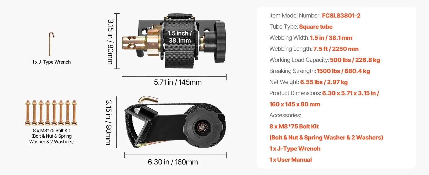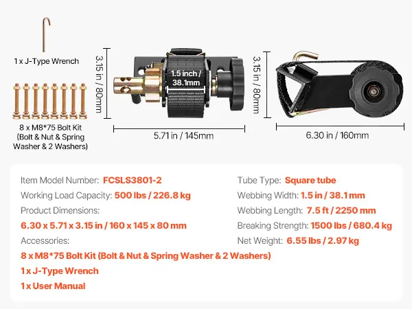 VEVOR Spanngurte für Leitergestell, schwarze Vierkantrohrbefestigung, 38 mm x 2,25 m, Ratschengurte mit doppelten J-Haken, 226,8 kg Traglast, Schnallenverschluss (2er-Pack) für Dachträger