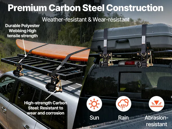 Stabile, straßentaugliche Konstruktion: Jedes 2,25 m lange Gurtband ist mit verzinkten Kohlenstoffstahlhaken ausgestattet, die für Stabilität und Korrosionsbeständigkeit sorgen. Der feste Halt verhindert ein Lockern auch bei langen oder holprigen Fahrten.