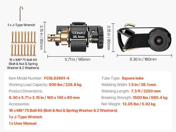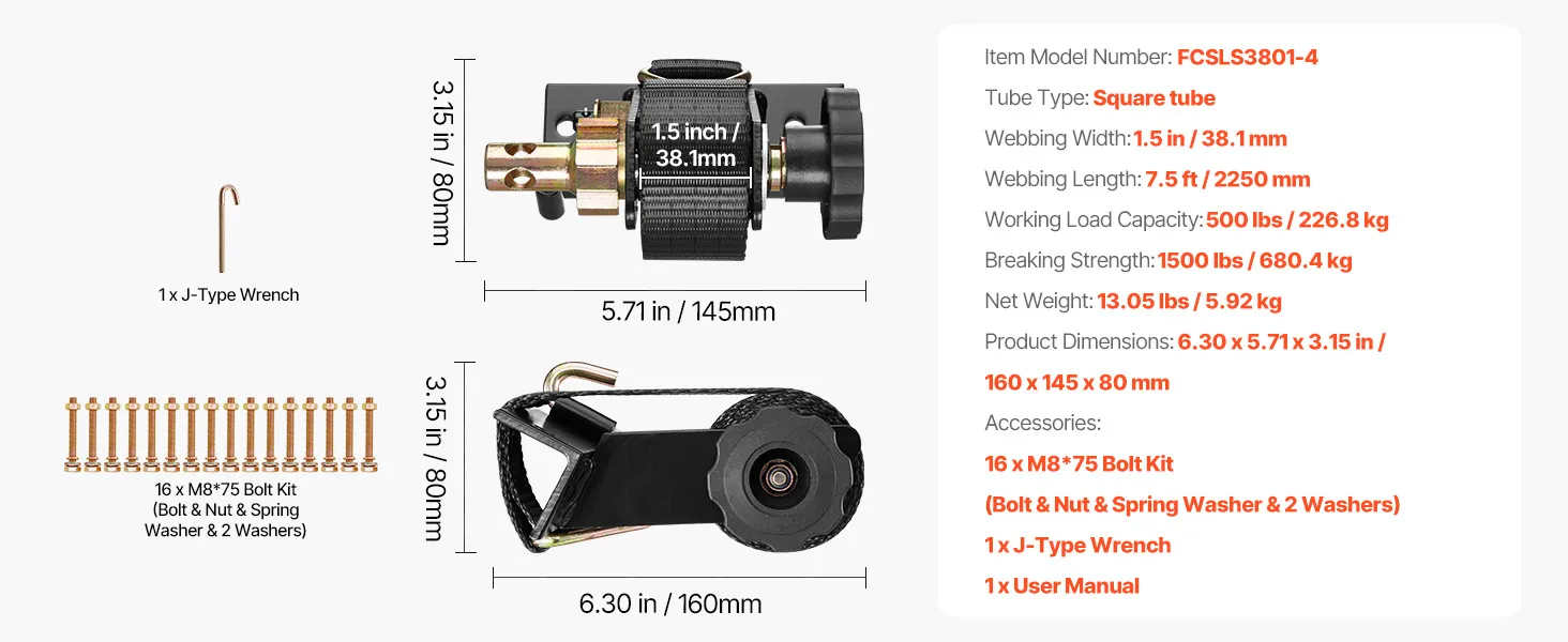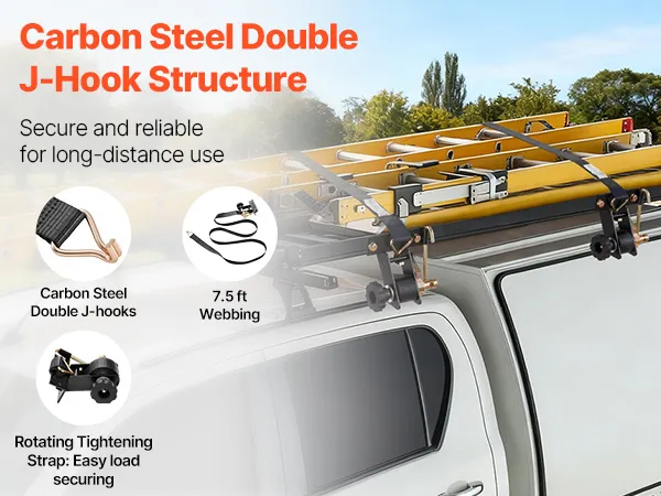 VEVOR Spanngurte für Leitergestell, Vierkantrohrbefestigung, 38 mm x 2,25 m, Ratschengurte mit doppelten J-Haken, 226,8 kg Traglast, Ladungsgurt mit Schnallenverschluss (4er-Pack)
