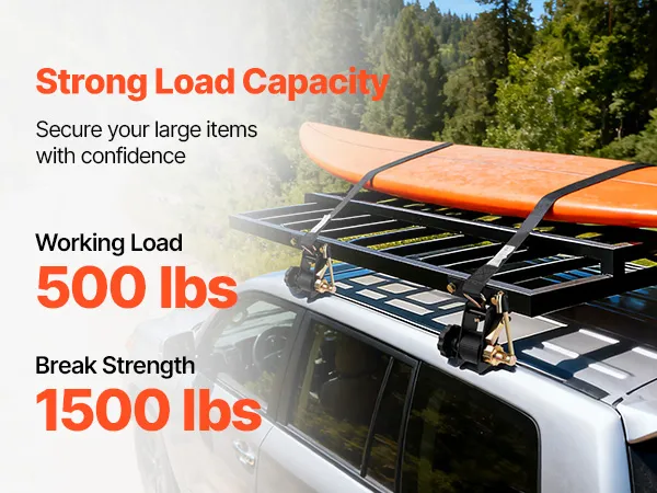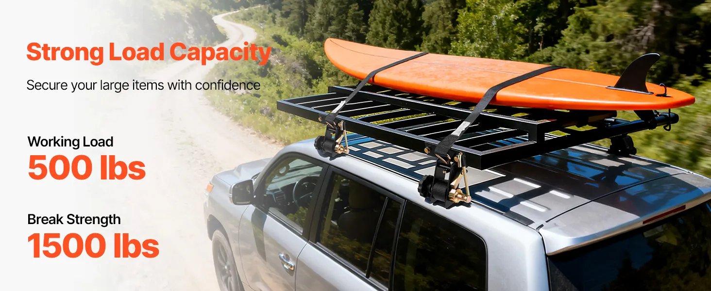 Diese Ratschengurte für Dachträger sind für eine Arbeitslast von 226,8 kg und eine Bruchlast von 680,4 kg ausgelegt. Sie helfen dabei, lange Leitern oder schwere Ausrüstung sicher auf Ihrem Dachträger zu befestigen und so für einen stabileren Transport auf der Autobahn zu sorgen.