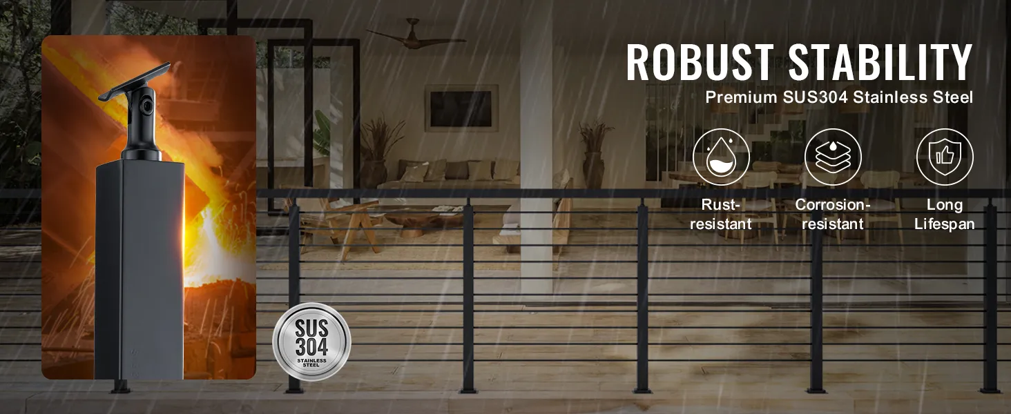 Der VEVOR-Kabelgeländerpfosten ist nicht nur funktional, sondern auch stilvoll. Sein elegantes schwarzes Design verleiht jedem Zuhause eine moderne Note. Die Edelstahlkonstruktion sorgt dafür, dass er jahrelang gut aussieht. Von traditionell bis modern ergänzt er verschiedene Wohnästhetiken. Sein Handlauf wurde entwickelt, um das Aussehen Ihres Raums zu verbessern. Dieser Handlauf ist eine stilvolle Lösung, die keine Kompromisse bei der Funktionalität eingeht. Das elegante Design macht ihn zu einer großartigen Wahl für den Innen- und Außenbereich.