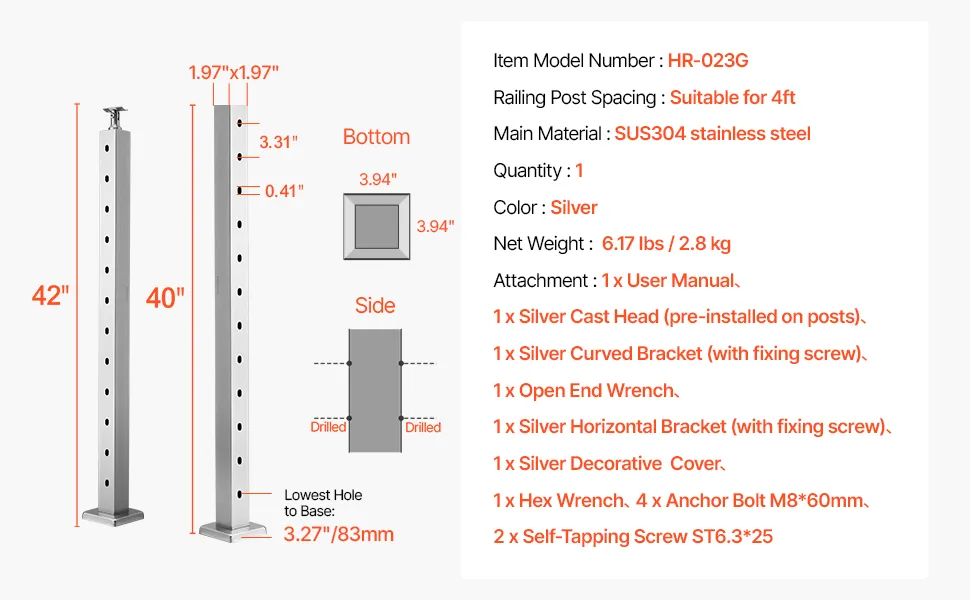 Robust und langlebig: Unser Kabelhandlaufpfosten besteht aus hochwertigem Edelstahl SUS304 und bietet hervorragenden Rostschutz und Korrosionsschutz für lange Haltbarkeit. Er wird jedoch nicht für den Einsatz an der Küste empfohlen. Hinweis: Tragen Sie vor dem ersten Gebrauch Rostschutzöl auf den Geländerschaft auf