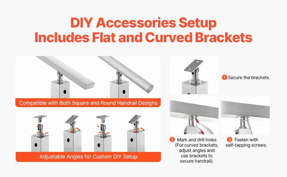 Einfache Installation und Selbstmontage: Dieser Terrassengeländerpfosten verfügt über horizontale und gebogene Stützen, die für verschiedene Lochtypen in Geländerpfosten geeignet sind. Er ist mit quadratischen und runden Rohrhandläufen kompatibel und ermöglicht die individuelle Anpassung der Handlaufwinkel