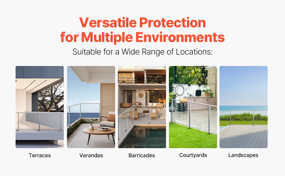 Dieses Terrassengeländer-Set eignet sich für Schutzanwendungen im Innen- und Außenbereich, beispielsweise für Terrassen, Treppen, Veranden, Zäune, Innenhöfe, Balkone, Gärten, Wohngebäude, Bürogebäude, Hotels, Garagen und mehr.