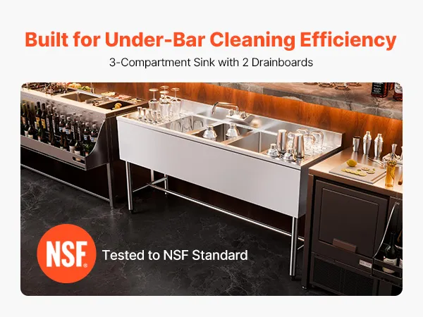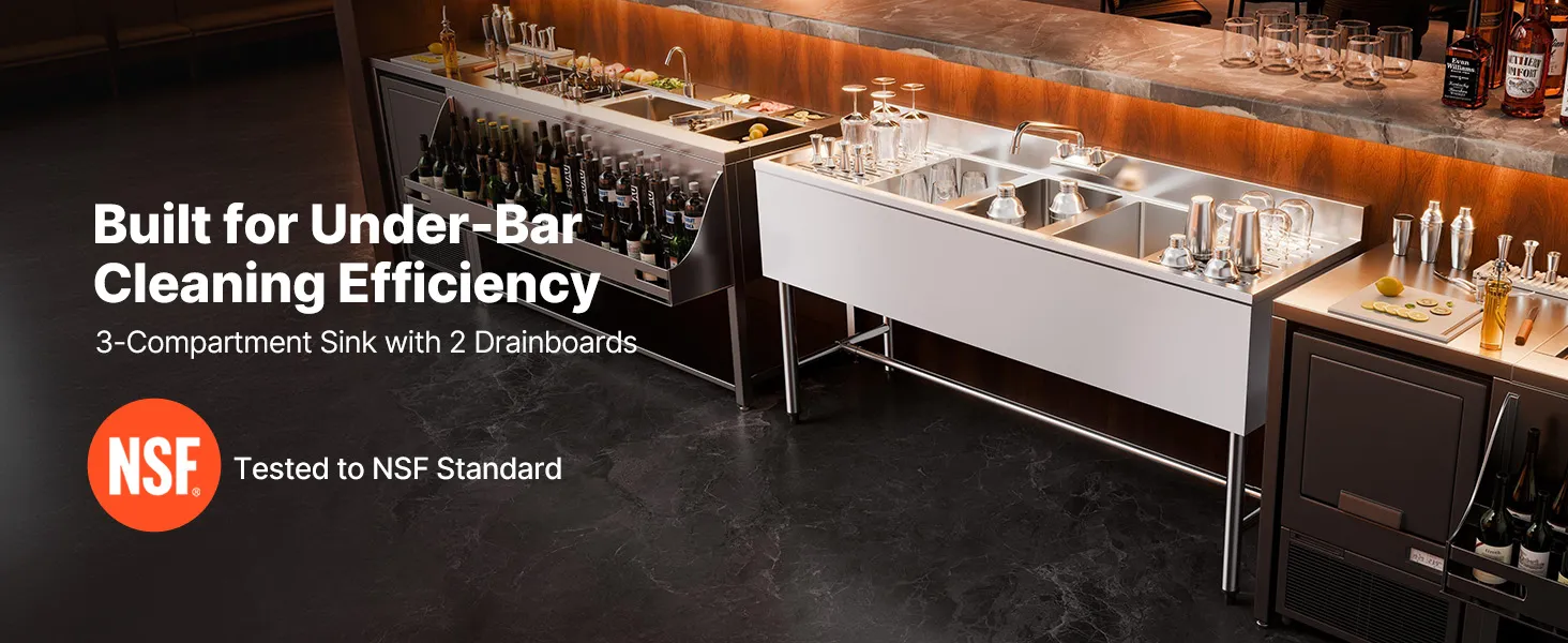 Heavy-Duty 18-Gauge Stainless Steel: Built with thick SUS304 stainless steel, this 3 compartment sink provides excellent rust and corrosion resistance. It's an ideal choice for busy under-bar or other commercial kitchen use