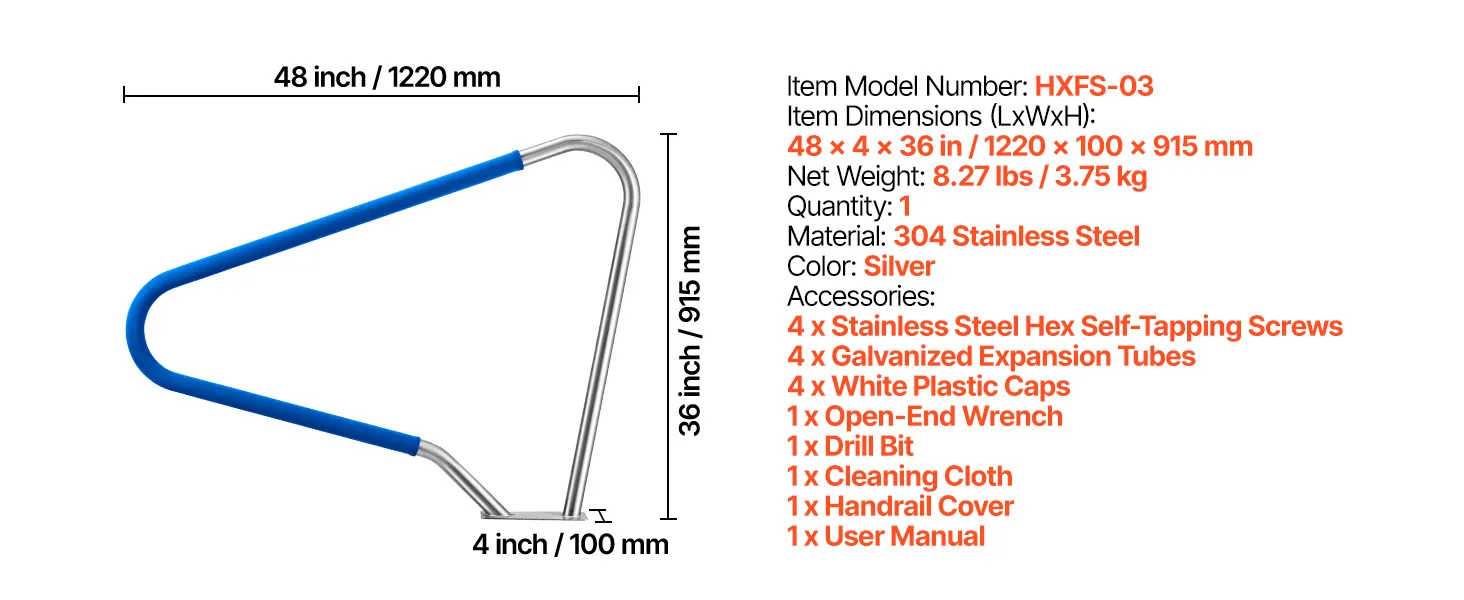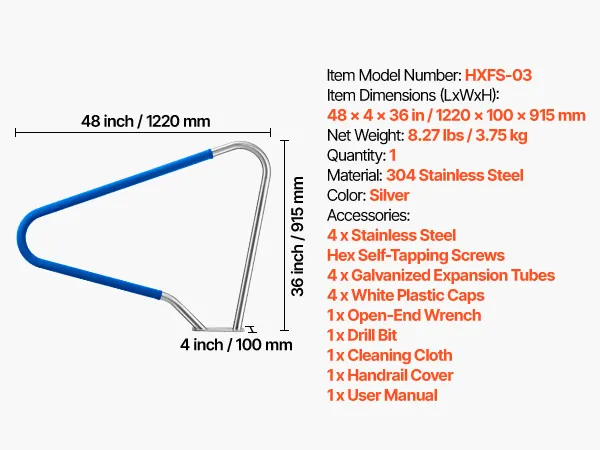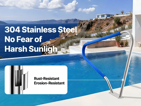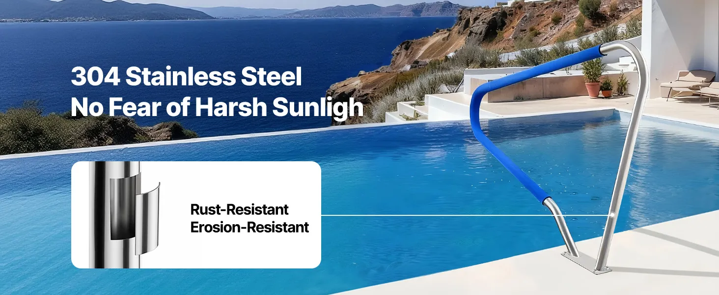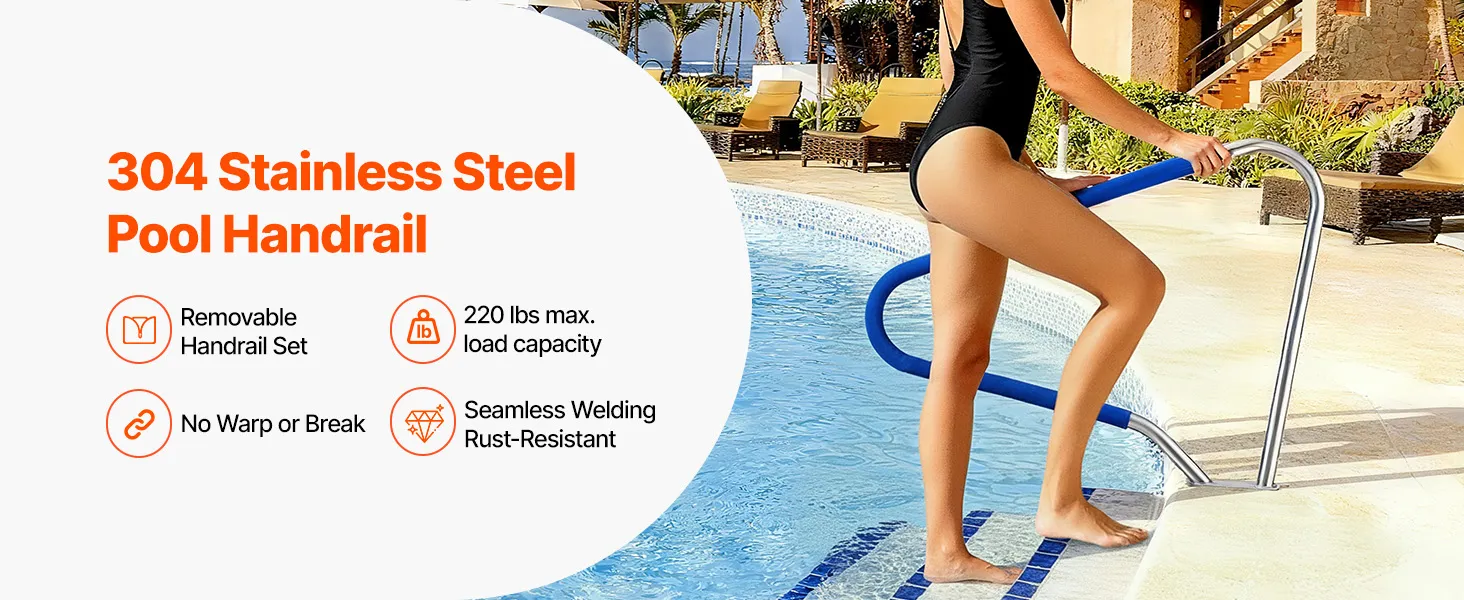 Unser Poolhandlauf ist aus Edelstahl 304 gefertigt und bietet dadurch dauerhafte Stabilität und Korrosionsbeständigkeit. Mit einer Tragkraft von 100 kg (220 lbs) gewährleistet er sicheren Halt beim Ein- und Aussteigen aus dem Pool.