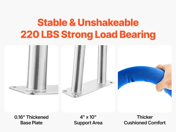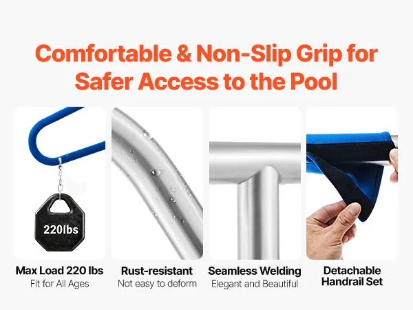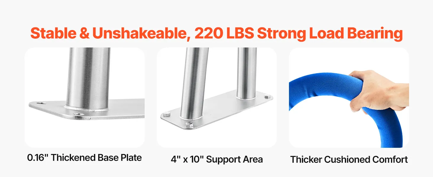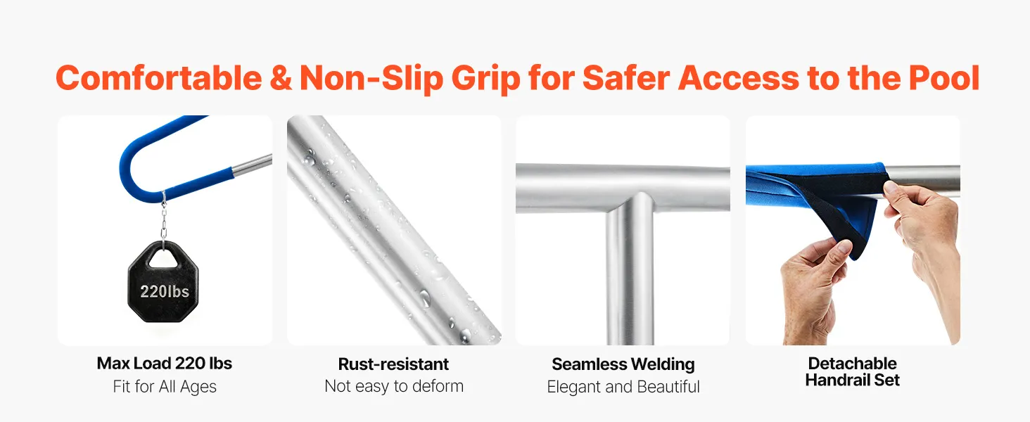 Belastbarkeit bis 100 kg (220 lbs): Unser Poolgeländer sorgt für sicheren Ein- und Ausstieg aus Ihrem Pool. Ob beim Hochziehen, seitlichen Abstützen oder vertikalen Drücken – das Geländer verteilt das Gewicht gleichmäßig und ist bruch- und verformungsbeständig.