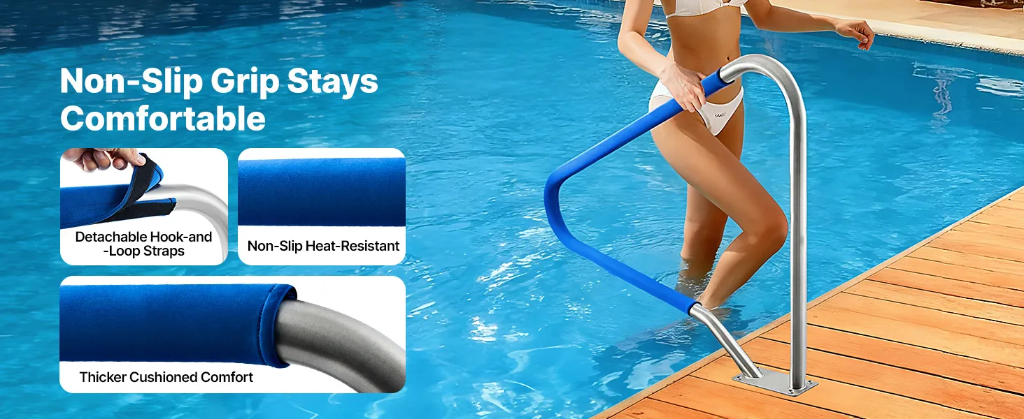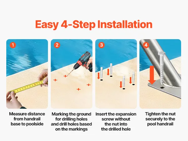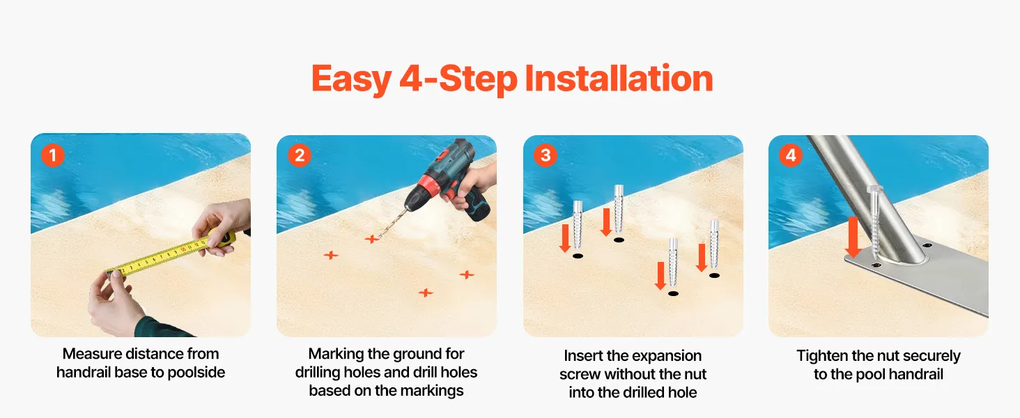 Vielseitige Einsatzmöglichkeiten: Kann auf Beton-, Holz- oder Ziegeloberflächen montiert werden. Ideal für Schwimmbadgeländer, Becken mit flachem Einstieg, Wellnessbereiche und Wasserparks. Erleichtert Senioren und Menschen mit Behinderung den Ein- und Ausstieg aus dem Schwimmbad.