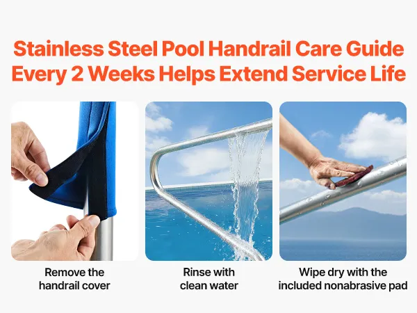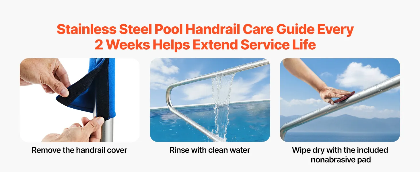 Konstruktion aus Edelstahl 304: Dieses verstellbare Poolgeländer aus hochwertigem Edelstahl ist rost- und korrosionsbeständig. Ein Reinigungstuch ist im Lieferumfang enthalten. Vermeiden Sie Salz-/Chlorpools, spülen Sie das Geländer mit Süßwasser ab und wischen Sie es sauber, um die Lebensdauer zu verlängern.