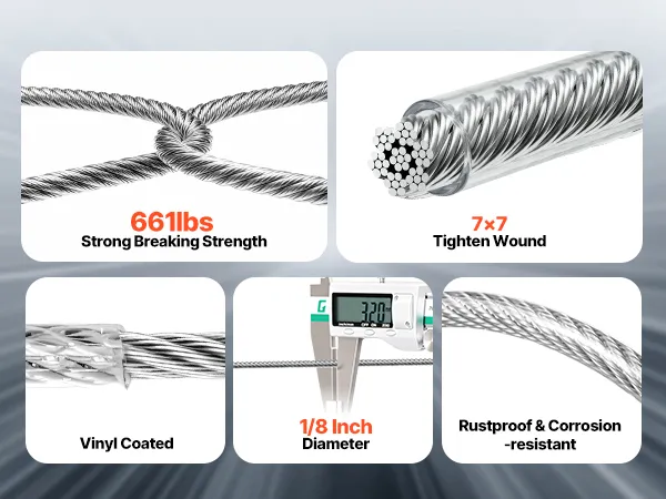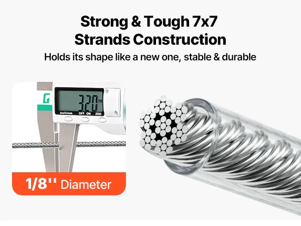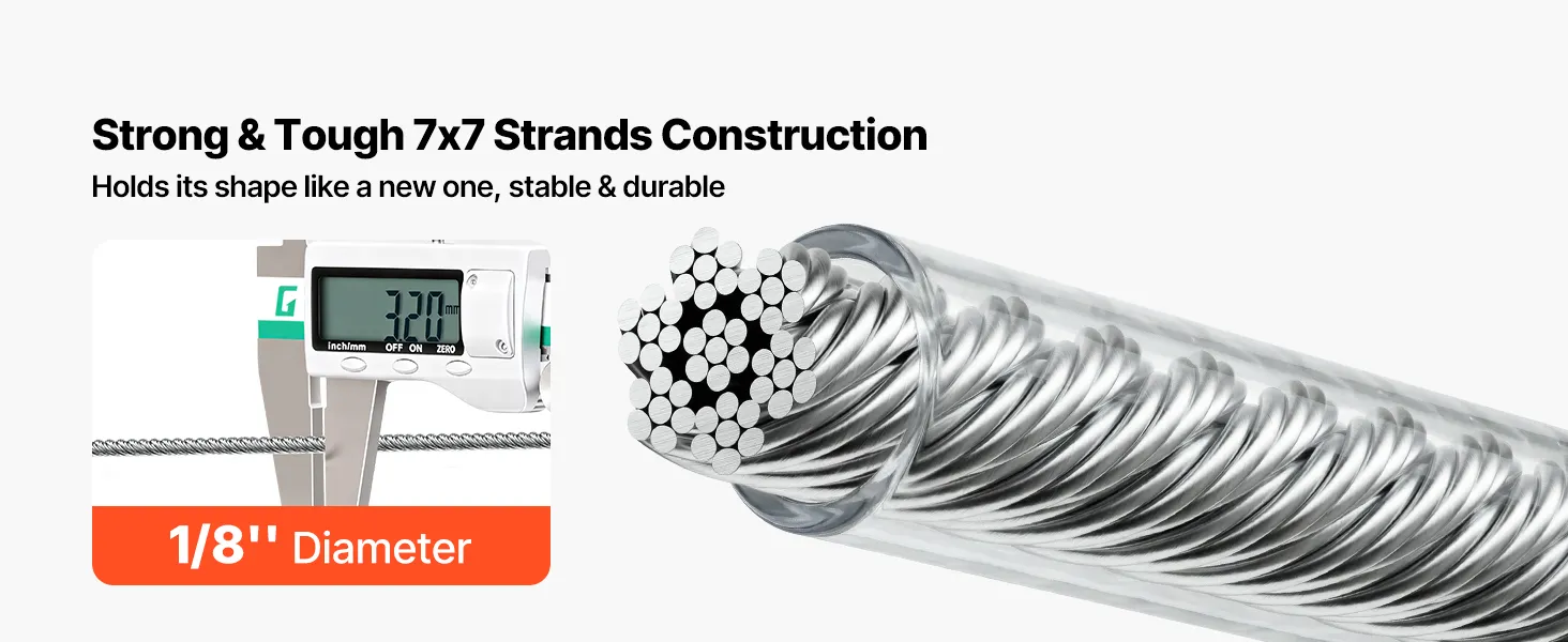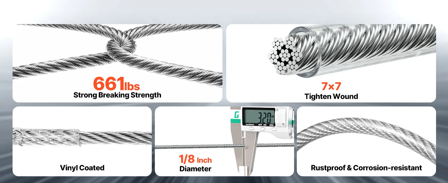 Hochwertiger Edelstahl 304: Dieses Stahlseil besteht aus Edelstahl 304 mit einem wasserdichten PVC-Mantel für optimalen Rostschutz. Es bietet eine enge 7x7-Litzen-Konstruktion und eine glatte, gratfreie Oberfläche für sicheres Handling