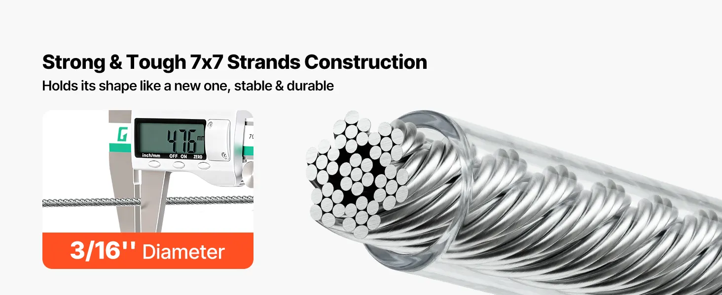 Hochwertiger Edelstahl 304: Dieses Stahlseil besteht aus Edelstahl 304 mit einem wasserdichten PVC-Mantel für optimalen Rostschutz. Es bietet eine enge 7x7-Litzen-Konstruktion und eine glatte, gratfreie Oberfläche für sicheres Handling.