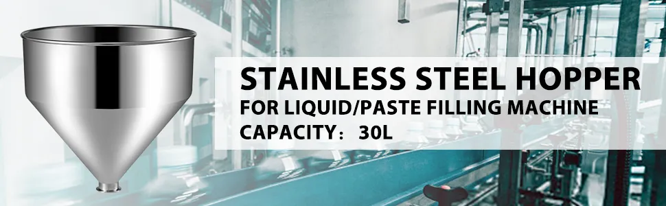 Dieser Trichter für Edelstahlfüllmaschinen ist perfekt für Flüssigkeits- und Pastenfüllmaschinen. Das volumen der trichter: 30L / 7,9 us gallon / 6,6 uk gallon . Auslassdurchmesser: 64 mm/2,52 Zoll. Das integrierte Formteil und die Pulverbeschichtungsoberfläche machen es robust für eine langfristige Verwendung.