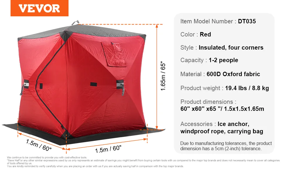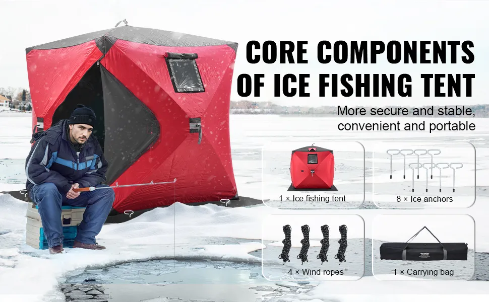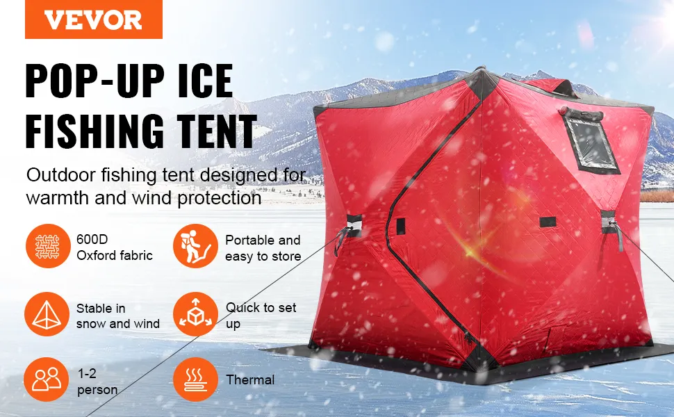 VEVOR Tragbares Eisangelzelt, Pop-Up-Zelt zum Eisfischen für 1–2 Personen, Angelzelt 600D-Oxford-Gewebe, Anglerschirm, Eishütte zum Winterfischen, Zelt mit Ankern/Seil/Tragetasche, 1,5x1,5x1,65m Rot