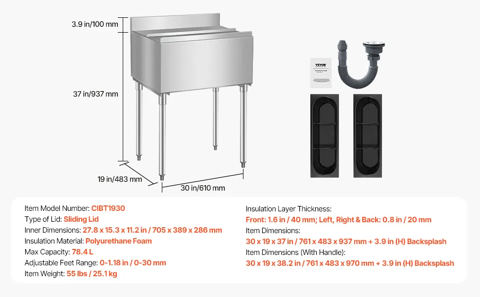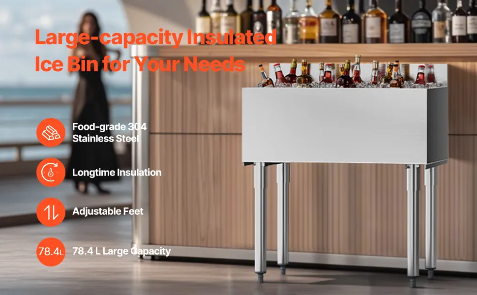 Mit einer Kapazität von 78,4 L kombiniert unser Eisbehälter gute Isolierung mit praktischer Funktionalität. Er besteht aus lebensmittelechtem Edelstahl 304. Ausgestattet mit verstellbaren Füßen passt er sich verschiedenen Oberflächen an und ist ideal für den vielseitigen Einsatz.