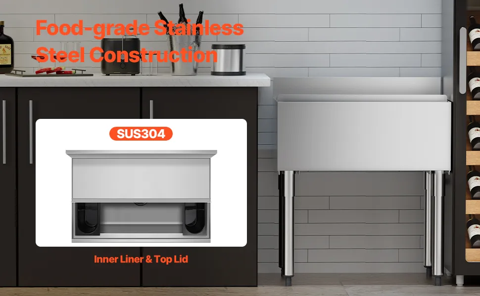 Unser Eisbehälter unter der Theke ist aus lebensmittelechtem Edelstahl 304 gefertigt. Die Innenauskleidung und der Deckel sind aus 304er-Edelstahl für Haltbarkeit und Sicherheit gefertigt. Zertifiziert von NSF für Ihren Seelenfrieden.