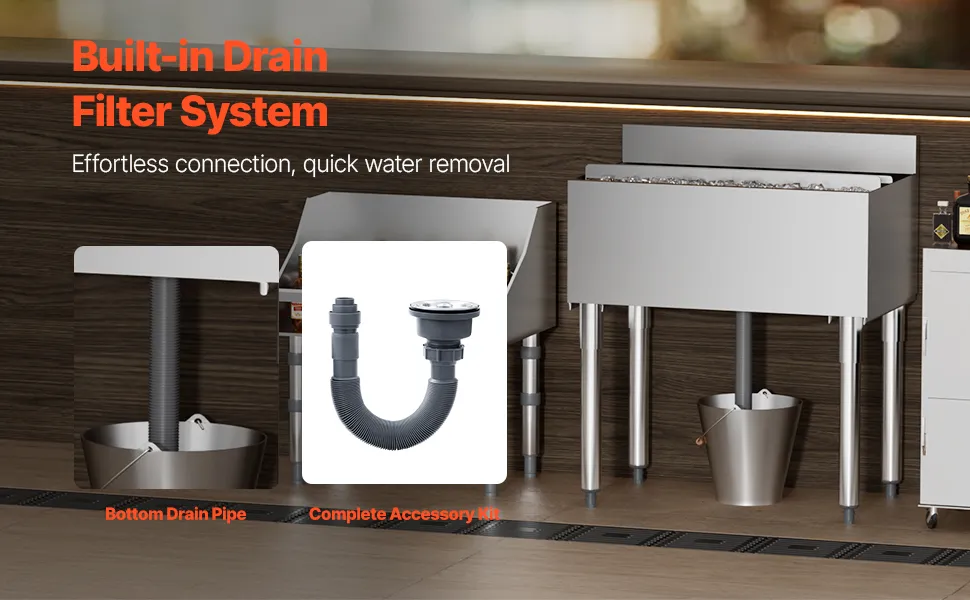 Hochwertige Materialien: Unser Untertisch-Eisbehälter ist aus lebensmittelechtem Edelstahl 304 gefertigt und verfügt über eine Isolierung aus Polyurethanschaum. Er sorgt für eine effektive interne Kältespeicherung.