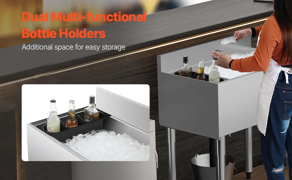Unser Untertisch-Eisbehälter verfügt über zwei Flaschenhalter für jeweils drei Flaschen. Er löst das Aufbewahrungsproblem für häufig verwendete Mixer oder Getränke, vereinfacht die Aufbewahrung und bietet zusätzlichen Platz.